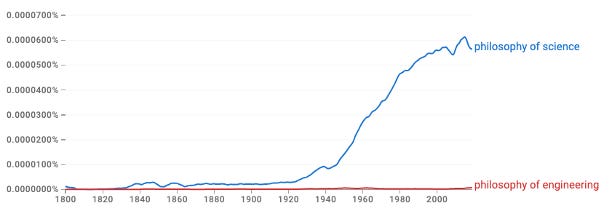 Engineers are simply not valued by society. By way of proof, there is a huge corpus of study about the philosophy of science, starting from the 1940s and with towering figures like Karl Popper, but no one’s talking about the philosophy of engineering (see the chart above). So we’re in an existential crisis for planet and society, and we don’t understand how the sector with the answer even works.